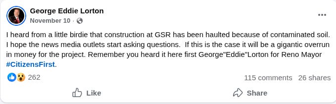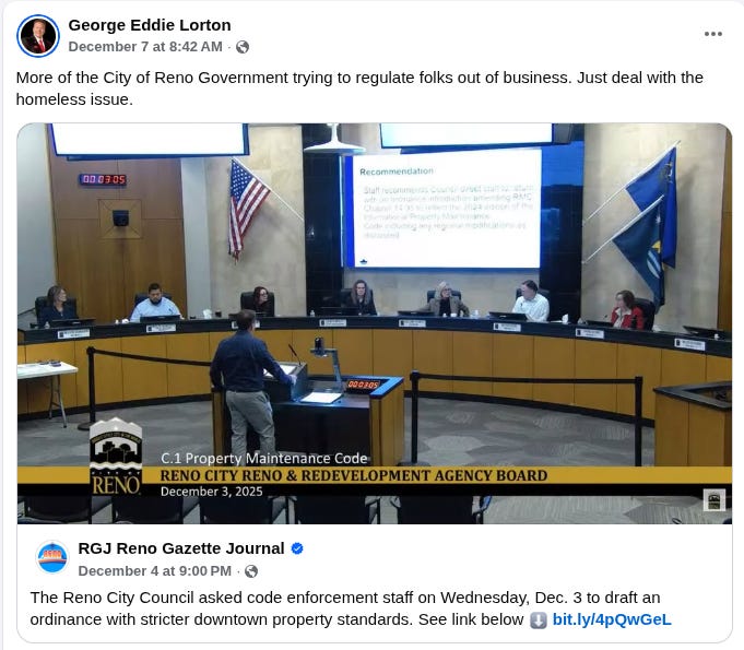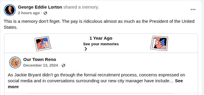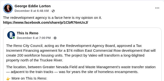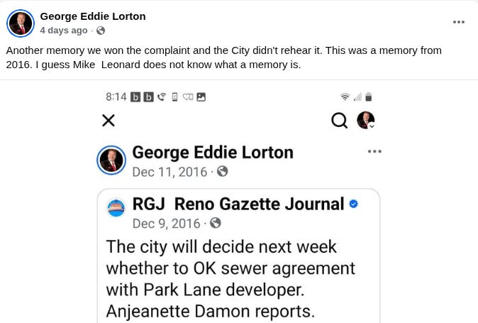Eddie Lorton’s Facebook page has functioned less like a mayoral platform and more like a running feed of grievance posts, partial narratives, and recycled “memories” that misstate how Reno works.