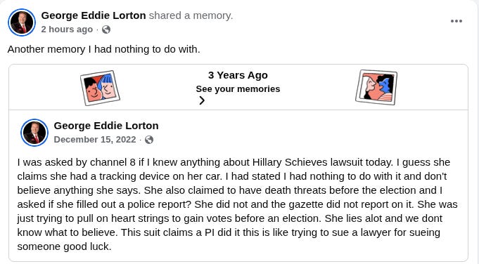 Eddie reposted a December 15, 2022, memory claiming he had nothing to do with the tracker placed on Mayor Hillary Schieve’s car.