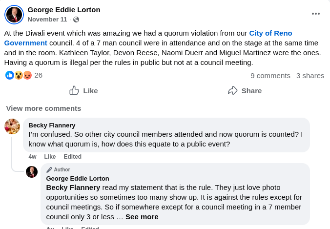 These claims reflect either ignorance of the Open Meeting Act or a willingness to weaponize it rhetorically. Someone running for Reno Mayor should know better.