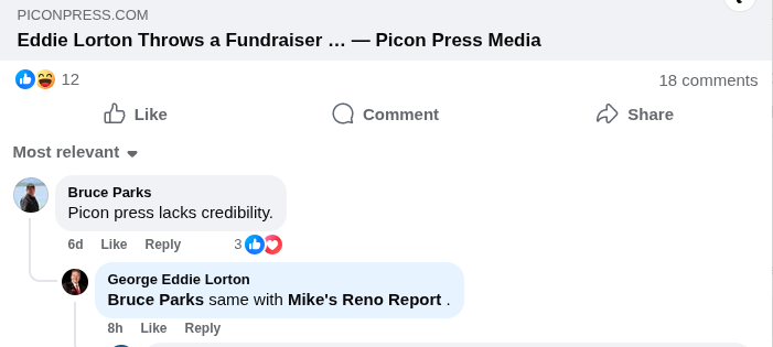 After Bruce Parks, Chair of Washoe GOP, publicly said Picon Press “lacks credibility,” Eddie followed up in the comments by claiming the “same with Mike’s Reno Report.”